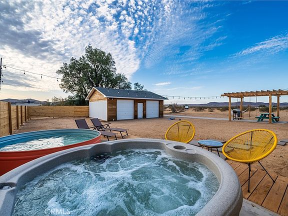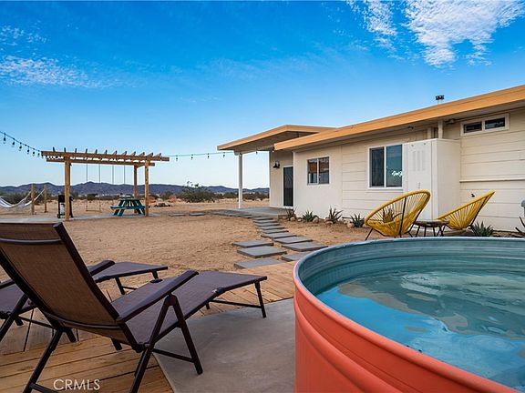 This captivating two-bedroom, two-bathroom, 3.4-acre Joshua Tree residence presents an unparalleled blend of comfort, style, and convenience. Fully furnished and ready to welcome you home, this property stands as a testament to thoughtful design and quality craftsmanship. As you step inside, you are greeted by a spacious open-concept living area, where natural light dances across polished concrete floors, highlighting the elegant wood accent beams that traverse the ceiling. The living room, equipped with efficient mini-splits, ensures year-round comfort, a theme that continues into both well-appointed bedrooms. The kitchen, a masterpiece of functionality and style, features an open layout that seamlessly connects to the living spaces. It is equipped with stylish concrete countertops, and offers a picturesque view of the backyard, creating an ideal backdrop for culinary exploration. A separate laundry room, with direct access to the back patio, adds a layer of convenience, echoing the home's thoughtful layout. The primary suite, a sanctuary of tranquility, boasts access to the back patio, a luxurious master bath with both a tub and shower, and a generous walk-in closet, ensuring a private and comfortable retreat. The second bathroom does not shy away from luxury, featuring a stand-up shower adorned with designer tile, showcasing the home's attention to quality and design. Outside, the property transforms into an entertainer's paradise. A covered patio and pergola set the stage for memorable gatherings, while the cowboy pool and spa promise endless relaxation under the starlit Joshua Tree sky. The detached two-car garage and wood privacy fence offer both functionality and seclusion. Located mere minutes from downtown Joshua Tree and the majestic Joshua Tree National Park, this home offers the perfect blend of accessibility and escape. Whether you're seeking an adventurous outdoor lifestyle or a peaceful retreat, this property is a gateway to the best of both worlds.