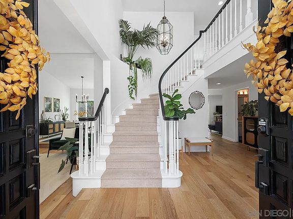 Located in the heart of La Costa, just a few minutes from beaches, golf courses, and top-ranked schools, this beautifully updated home is set at the end of a quiet cul-de-sac. Offering the ideal blend of style and comfort, the thoughtfully designed floor plan features a spacious open-concept kitchen and family room with fireplace, formal living and dining areas, and a coveted downstairs bedroom with a full bath. Natural oak wood flooring complements the light-filled interiors, while the remodeled baths showcase designer finishes, custom vanities, Silestone quartz countertops, and high-end fixtures. Framed by sliding glass doors, the large backyard is perfect for entertaining or play, complete with sparkling free-form pool and spa, expansive grassy areas, and outdoor shower. A dedicated laundry room adds everyday convenience, while the finished garage—with newer epoxy floors, built-in cabinetry, and updated lighting—complete this move-in ready home that perfectly balances function, warmth, and California living.
