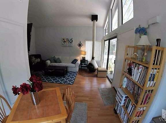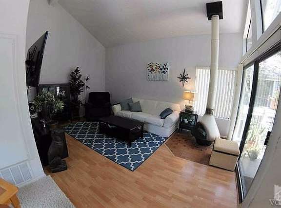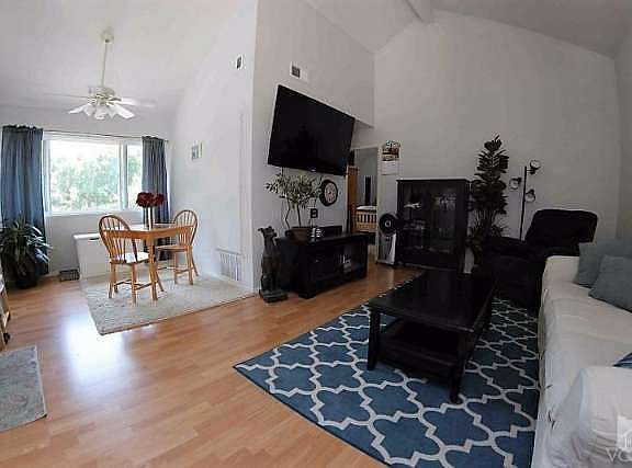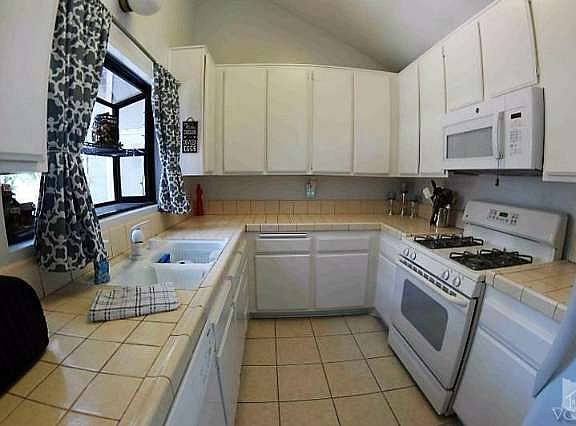 This beautiful unit is located in the heart of Camarillo and features vaulted smooth ceilings, newer windows, open kitchen with tile floors, tile counters and newer appliances. The open living room has a potbelly fireplace and window to the ceiling the bedroom has high ceilings a walk in closet the bathroom has a shower/tub combo and plenty of counter space. There is a large private patio with laundry room. There is also a detached two car garage with a roll-up garage door. The beautiful complex has running streams, community pool and spa. The complex is located near schools, shopping, parks and restaurants.
