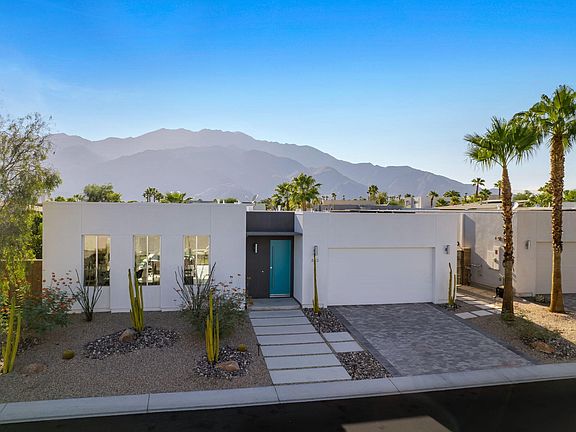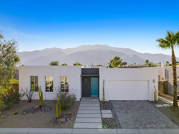 If you are seeking clean, modern design from one of the desert's premier builders, look no further than this elegant home built in 2015 by Alta Verde and designed by award winning architect Anthony Poon. This L-shaped three bedroom 2549 sq ft home orients toward Palm Springs' best exposures, west and south. The views from the main living space are extraordinary, across the pool and private block-walled yard toward the grand San Jacinto mountains. Originally presented as ''the Garden model -- a Glass House Plan,'' this description captures the feeling created by 10' ceilings, floor to ceiling Fleetwood glass sliders, and the large open plan living space. Other notable details include Italian cabinetry, quartz counters, stainless Bosch appliances, sculptural standalone tub in the primary, custom wallpaper, and custom tile in the primary. As newer construction, this home is highly energy efficient, and includes low-E glass, tankless water heater, owned solar, and dual zone AC. Located within the prestigious guard-gated Escena community, which includes an Jack Nicklaus designed golf course (public, no homeowner fees!) and beautiful clubhouse with a popular restaurant and spectacular views. The HOA is low, the land is fee, and the lifestyle is the best in the desert.