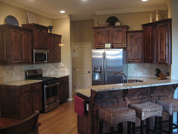 Gorgeous home in the Nixa school district with amazing curb appeal and custom features throughout. Beautiful hardwood floors throughout the main living areas and kitchen. Great open floor plan that flows well from the living room to kitchen and dining room. Granite counter tops along with stainless steel appliances and plenty of cabinets for storage. In the dining room there is a stone gas fireplace and the backdoor that leads out to the covered and screened in back patio. The front bedroom has vaulted ceilings, the back bedroom has tray ceilings and large closets. The main bath has tiled floors, vanity with granite top, tub/shower combo and a skylight. There is a large office with 10 foot ceilings, crown molding and double french doors. The large master suite has a beautiful master suite with tiled floors, walk in shower, soaking tub, double sinks and a large walk in closet. Don't miss the landscaped back yard and storage shed.