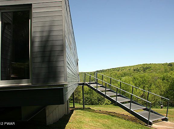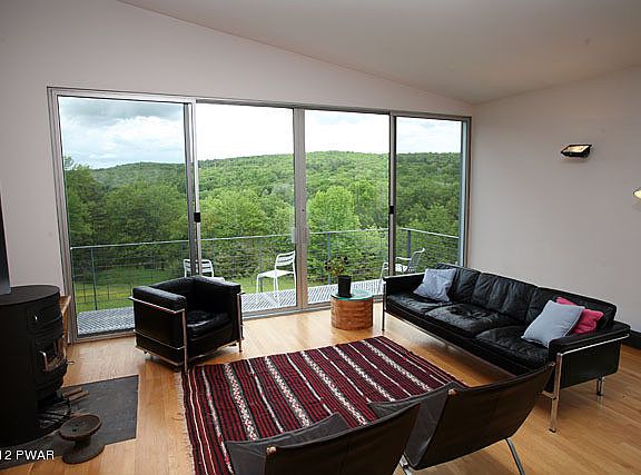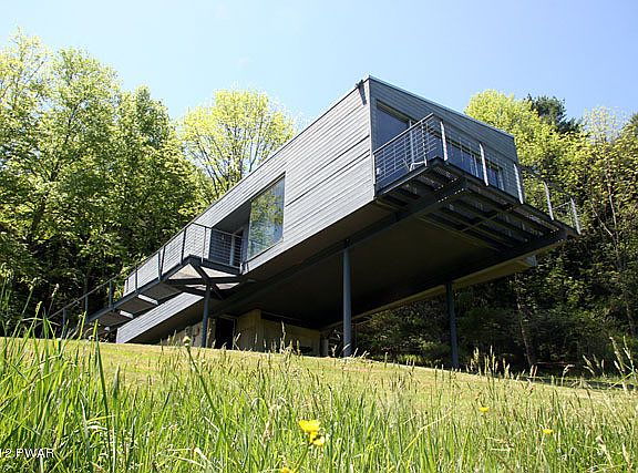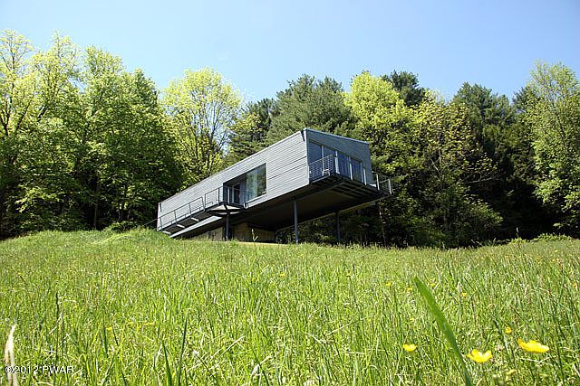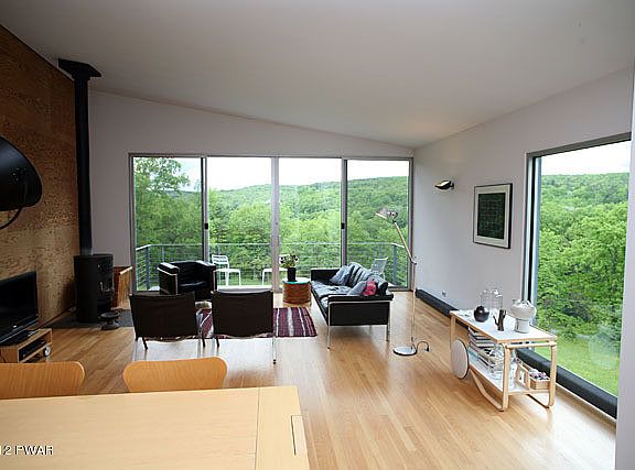 Featured in DWELL Magazine's 100 Favorite Houses issue, this architect-designed contemporary juts out of a gentle hillside overlooking the Delaware River. It offers maximum design features, glass, and views in a minimum footprint. Inside, you feel that you're outside among the meadows and woods, due to the huge glass end of the house. Kitchen features Bosch & Sub-zero stainless appliances. Living room has hardwood floors, woodstove, panoramic views. Deeded access to Delaware River., Beds Description: 2+Bed1st, Baths: 1 Bath Level 1, Baths: Modern, Eating Area: Ultra Modern KT, Eating Area: Dining Area