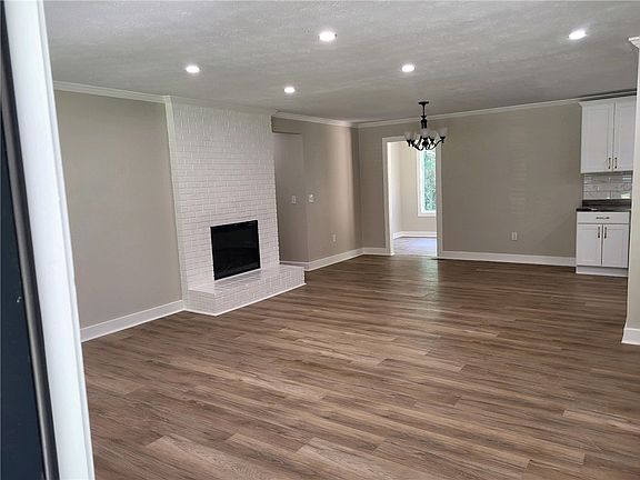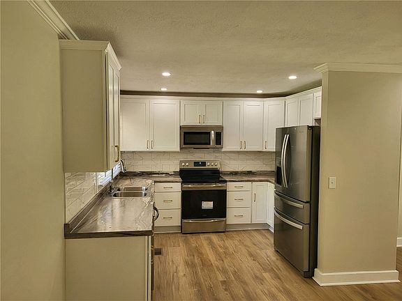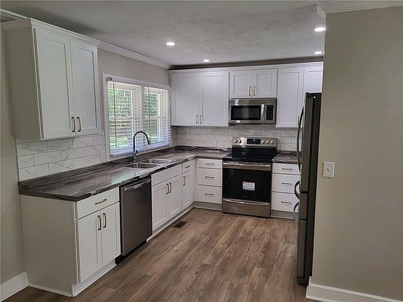 Beautifully remodeled all-brick 4 bedroom, 3 full bath home. Four bedrooms and 3 full baths. Front door with side lights walks into over 400 sf Living Room and electric flame heated fireplace with remote. Open floor plan features dining area at end of living looking into sun room. Relax in sun room which walks out onto large deck where buyer can enjoy their morning coffee overlooking the mature wooded backyard. Master bedroom is 400+ sf with luxury laminate vinyl and 9 ft closet. New full bath with tiled tub/shower combo, double sinks, and luxury vinyl laminate. Kitchen is new with range, refrigerator, and microwave, all stainless steel, beautifully appointed with soft-close cabinets, 5" pulls, and designer countertops. Sink looks out onto deck at wooded back. Three additional bedrooms feature carpet with plush pad and roomy, walk-in closets. Hall bath features stunning stand-alone custom vanity and tub shower combination. Third bath connects to bedroom 3. Paved driveway.