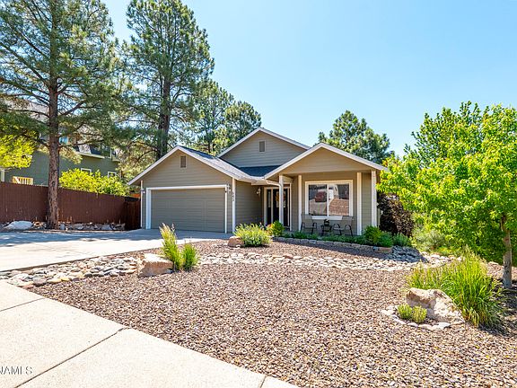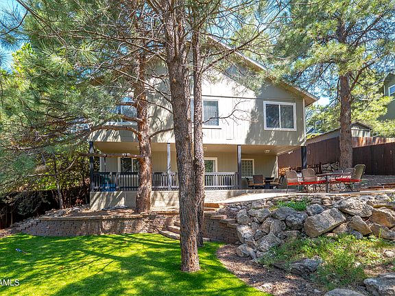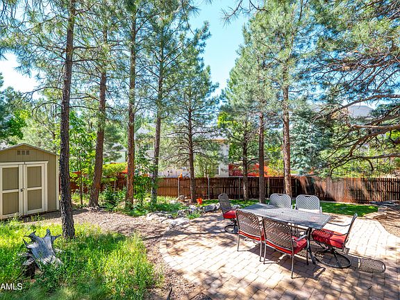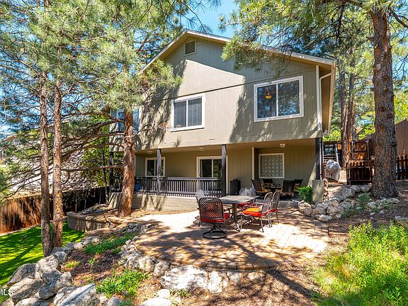 This stunning, true 4-bedroom, 3-bathroom plus extra flex room home is nestled in the highly sought-after neighborhood of Ponderosa Trails. As you enter the home, you immediately feel welcomed by the spacious family room with picture windows & an open kitchen with a fantastic center island that flows into the dining area. A main-floor bedroom wi/ a full bath is conveniently located for guests or those seeking multigenerational living, plus an additional flex room. Downstairs, the primary bedroom features an en-suite bath with dual vanities, a separate tub, & a shower w/ large walk-in closet & slider access to the back patio. Two more bedrooms & a full bath with loads of hidden storage give you all the extra space you need. Amazing curb appeal w/ a flat driveway. Spacious backyard that is fully fenced, storage shed, patios, & artificial grass. Close to NAU, shopping, dining, and outdoor activities. Ponderosa Trails connects to the FUTS Urban Trail system, Mountain School, and the City of Flagstaff Park. Schedule your private showing today!
