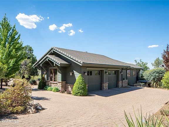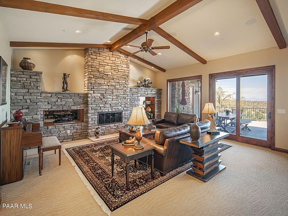 Amazing and rare single level home behind the main gate at Hassayampa Village Community.Views of the 1st hole of Capital Canyon Golf Club, Thumb Butte and San Francisco Peaks. Upgrades everywhere you look with beamed ceilings, hardwood flooring, stone and alder built-in cabinetry. Chef's kitchen with alder cabinets, newer appliances, granite counters and large pantry. Oversized Master Suite with 2 spacious walk-in and professionally organized closets. Masterbath features extra large tiled shower with 2 showerheads and jetted tub. Beautiful executive office with built-ins and private bathroom plus additional Ensuite on other side of home.Extra large laundry room with cabinetry and utility sink. Oversized 2 car garage with triple epoxy flooring and large storage closet.In-law suite