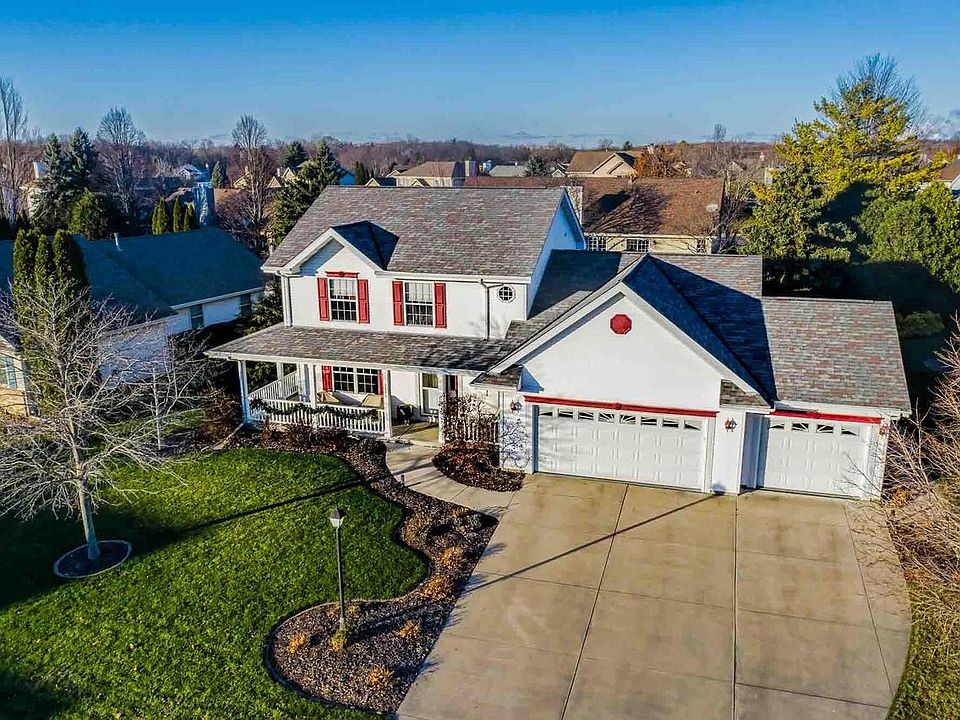 Beautiful Colonial Style 2-Story home in popular Jamestown Subdivision is available due to a relocation. You will love this amazingly cared for home and all of the updates. First floor features a large updated kitchen with quartz counter tops (2021) with stainless steel appliances and island, a spacious family room, dining room, living room and laundry. The second floor features three large bedrooms all with cathedral ceilings and jumbo closets with two full bathrooms. The lower level has a carpeted den, office, exercise area, with a full bathroom with a newer furnace and central AC (2023) with WIFI thermostat. The immaculate spacious heated 3-Car tiled garage with utility sink and water makes for year round use of the garage. Home has a central vac and a beautiful landscaped yard.