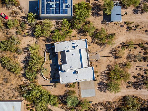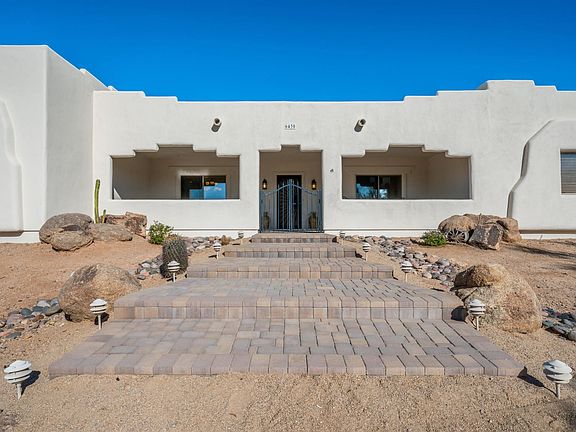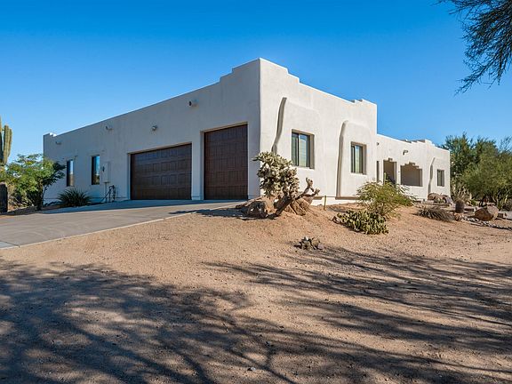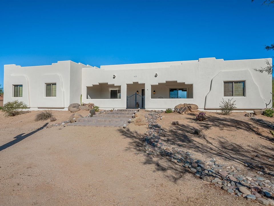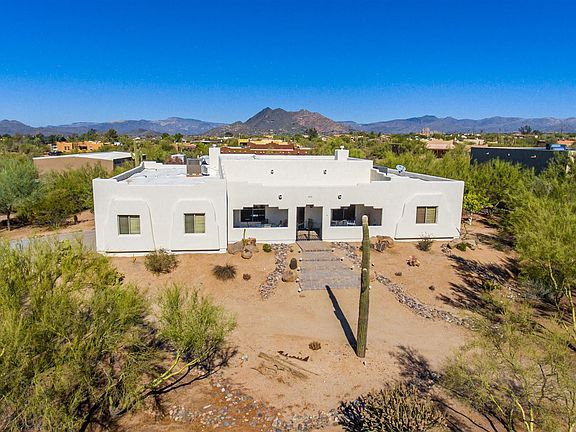 Wonderful Santa Fe 4 bdrm/3 full bath home on 1.136 acre in N Scottsdale! Freshly painted exterior! Custom built in 2002 - original owner shows pride of ownership! Open great room concept w/12' ceilings & spacious eat-in gourmet kitchen w/granite counters/island/breakfast bar & 2016 KitchenAid SS double wall ovens, MCW & 5 door French-door refrig & 2018 KitchenAid dishwasher. Split Master has his & her closets, separate shower & jetted soaking tub, dual sinks, travertine counters, tub & shower surrounds. One guest room is separate from the others w/Arcadia door/ensuite bath for guest privacy! 2 FP's/propane. Front security door! 7 skylights! 2 HVAC's repl 1 in 2017 & 1 in 2020. Water heater repl 2014. Water softener, security system. Covered back & front patios. Horses allowed!