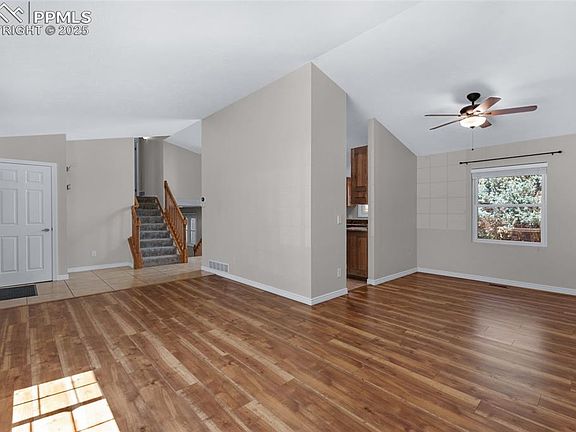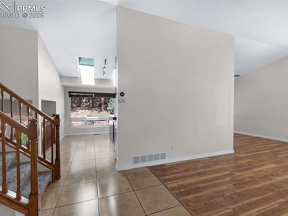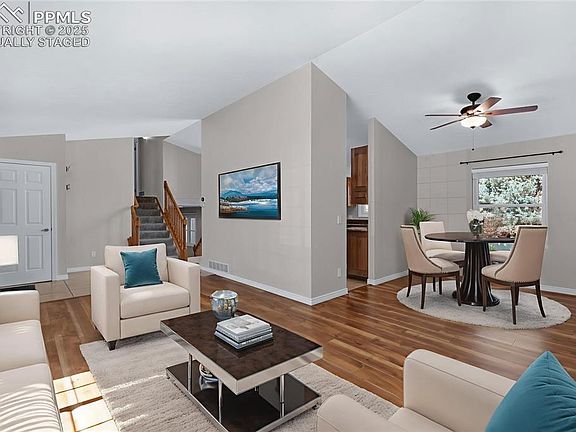Set on a desirable cul-de-sac lot in the highly sought-after Tamarron at Rockrimmon neighborhood, this spacious home offers a rare combination of privacy, mountain views, & outdoor adventure right at your doorstep. The oversized backyard provides sweeping views of Pikes Peak and is an ideal space for relaxing or entertaining. A small path winds through mature pine trees, leading to the upper yard with room to roam. Enjoy immediate access to nature with the Ute Valley trail system just a short walk away, and bike access to Santa Fe, Pikes Peak Greenway, and Blodgett Open Space trails. Nearby parks like Golden Hills and Mountain Shadows add to the outdoor appeal, while shopping and conveniences—like Safeway—are just a 2-minute walk through the back gate. Inside, the home offers formal and informal living spaces with vaulted ceilings, abundant natural light from oversized windows and skylights, and a bonus sunroom off the family room. The kitchen features granite countertops, stainless appliances, warm wood cabinetry, & a pantry. A cozy lower-level family room includes a cozy wood stove insert and bedroom or office. Upstairs, three bedrooms include a large primary retreat with a walk-in closet and en-suite bath. The unfinished basement offers ample storage or the opportunity to create additional living space. Significant updates have been completed throughout the home: luxury vinyl flooring, new carpet, bathroom refinishes, radon, complete interior & exterior painting, partial siding, cedar fencing, vinyl egress windows, a new sump system, and central AC with Nest thermostat. Newer features also include a water heater, high quality steam humidifier, electrical panel extension, backyard landscaping with boulder terracing & French drain system, smart sprinkler controls, new gutters, updated garage door mechanisms, & sliding glass door. An unbeatable northwest location, extensive upgrades, and a setting showcasing Colorado’s natural beauty! 3 virtually staged photos used.