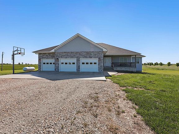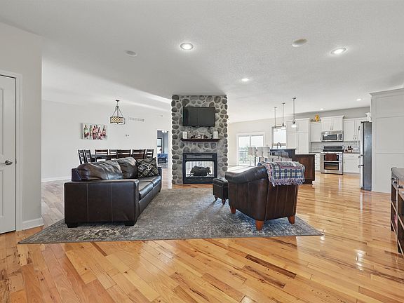 Nestled on just under 10 acres of peaceful countryside, this beautifully designed 5-bedroom, 3.5-bathroom walk-out ranch offers the perfect blend of luxury, comfort, and privacy. Step into the open-concept main floor featuring hardwood floors and a striking see-through stone fireplace that adds warmth to both the living and dining areas. The spacious kitchen seamlessly connects to the living space, making it ideal for entertaining or enjoying family time. The main level boasts 4 generously sized bedrooms, including a luxurious primary suite complete with his and hers walk-in closets, a spa-like bathroom featuring a jetted tub, a large walk-in shower, and dual vanities. A conveniently located laundry room and half bath completes the main floor layout. Downstairs, the finished walk-out basement is a true retreat with a custom wet bar, additional bedroom, full bathroom, bonus room perfect for a home gym or office, and a large storage area. Step outside to your expansive deck that overlooks a serene pond and fire-pit area—ideal for summer evenings under the stars or peaceful mornings with coffee and a view. With ample indoor and outdoor living space, this exceptional property offers the tranquility of country living just minutes from modern conveniences. Schedule your private showing today—this one won’t last long!