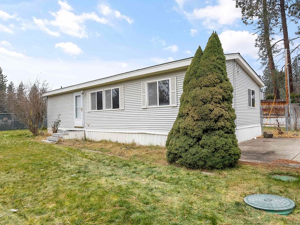 Nestled on a spacious .4 acre corner lot in Nine Mile Falls, this 950 square foot manufactured home offers a comfortable living space and room to enjoy the outdoors. Brand new roof with vinyl siding and an oversized two-car garage, the home combines durability and functionality. Inside, the floorplan includes three bedrooms and two baths. The primary suite features an ensuite full bath for privacy. Central A/C for those warm summer months. Outdoors, the fully fenced yard provides room for gardening and entertainment. The hot tub and patio area create a perfect spot for relaxing and family barbeques. The oversized two-car garage offers sheltered parking and plenty of room for storage or projects. An automated sprinkler system keeps the lawn lush and landscaping pristine with little effort. A convenient location just minutes from local amenities. With an open layout, this Nine Mile Falls home blends convenience and comfort!