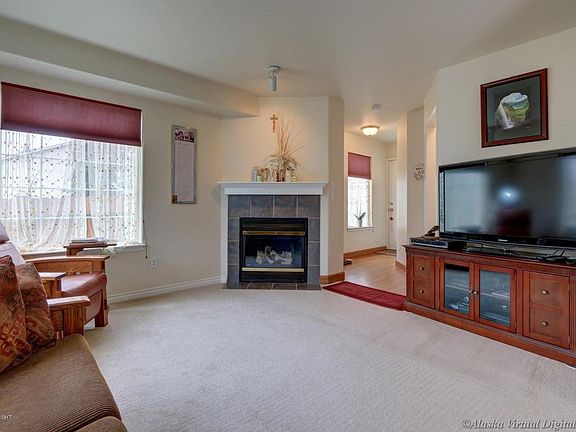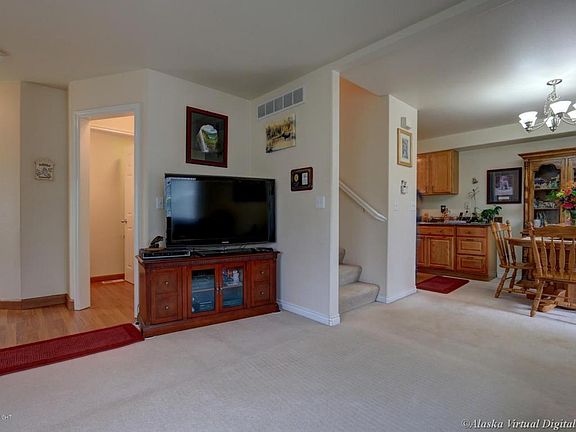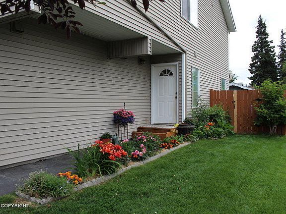 Original owner has loved this home! Two story floor plan w/ private master bath & walk in closet. Living room down and separate office or family room upstairs. Incredible landscaping & gardening is absolutely stunning to view. Apple trees, rhubarb, lilacs, rose bushes. Great sun exposure plus end unit w/ fenced yard is your own private oasis! Great access to JBER, schools, shopping, parks & more.