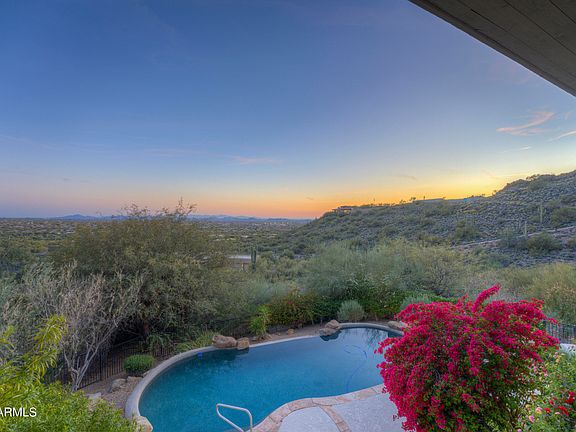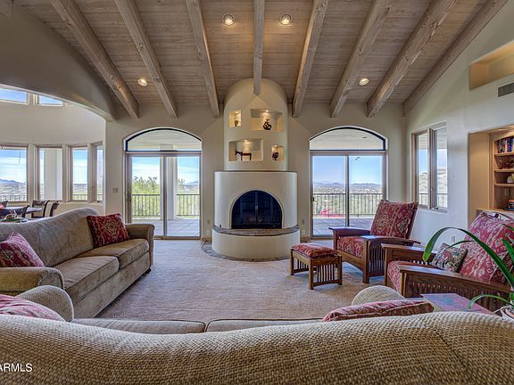 Welcome to gated Carefree Grandview Estates-a premier address in Carefree. Exceptional custom home, nestled on 2.5 acres on Black Mountain. Sweeping views and City lights. Dramatic paver driveway & motor court, leads to distinctive residence, private guest house & Unique 9 car garage/workshop. All one level residence. Welcoming courtyard and artistic entry doors open to expansive great room with fireplace and stunning wood beam ceilings which repeat throughout home. Large wrap around patio, accessed from many rooms & provides perfect setting for entertaining & relaxing in the tranquil surroundings. Alluring, secluded primary wing with fireplace & patio. Sunny east kitchen & breakfast room open to outdoors. Private office-abundant storage. Truly Remarkable Home-See Remarks for updates. enchanting views of city lights & gorgeous desert terrain. Private, refined, & tranquil, this is the epitome of Carefree living.