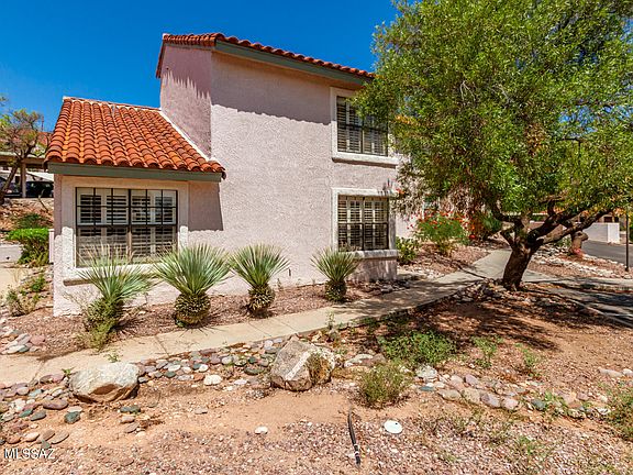 This Beautiful Two story end unit with private entrance in the popular Tierra Catalina Condominium offers 3-bed, 2-bath interior features vaulted ceilings, neutral palette, plantation shutters, abundant natural light, with carpet & wood-look tile flooring. You'll love the living room with a candle fireplace for chilly nights! The kitchen boasts SS appliances, tile counters, wood cabinetry, a cozy nook, and a serving window w/breakfast bar. Upstairs you'll find your private owners suite with a full bathroom & a walk-in closet. Both bedrooms downstairs, great for the guests. Discover the covered patio with artificial turf, perfect for blissful relaxation! Don't forget the Community tennis/pickle ball court & pool/spa for year-round enjoyment.