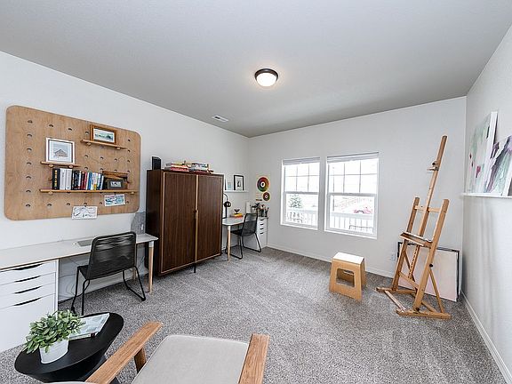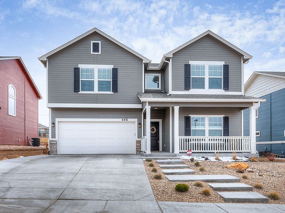 This beautiful two year old home with views of Pikes Peak and open space in Wolf Ranch will draw you in from the large entryway and open office space to the spacious living room with a stone-surround gas fireplace and kitchen with tons of upgrades! White cabinets, walk in pantry, double ovens, granite counters, custom quartz island and more. Upstairs includes a large loft, laundry room with plenty of cabinetry and three bedrooms with walk-in closets. The oversized master bedroom has room for a seating area, a five-piece bathroom and generous closet. Outside you can enjoy patio living with space enough for outdoor dining and lounging under a custom made pergola. Wolf Ranch pool access included in HOA dues. The Remington trail with views of open space can be accessed just across the street just beyond the pocket park.