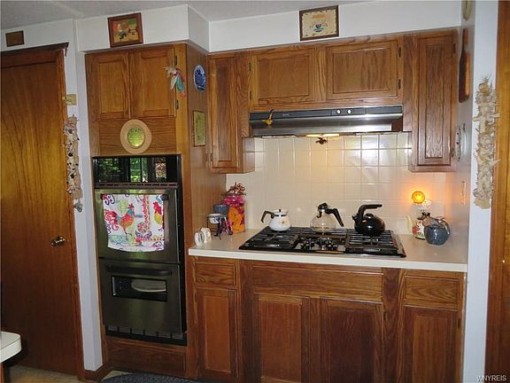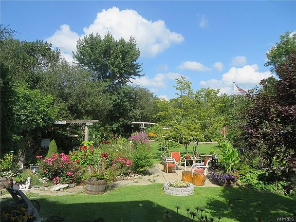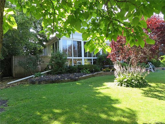 Custom built DeAngelo ranch sit on 1.9 acres. Beautiful perennial gardens w/Koi pond and a natural pond at rear of property. Enjoy the covered front porch or the comfortable rear sun room. Nice foyer entry, 22 x 15 living room holds wood/coal burning fireplace w/2 ceiling fans. Formal DR with bay window, efficient kitchen has breakfast bar open to family room. Built in gas stove, all SS appliances stay, double pantry,lots of hardwood cabinets. Huge master bdrm w/full bath and walk in closet. Add'l full and half bath. Fantastic sun room overlooks grounds. Above ground pool w/deck, workshop w/ wood stove and garden shed.Full bsmt,Dunkirk Boiler new in 2014, HWT 2015, 2 wall A/C units.Open lawn area at west side of property,pine trees, fruit trees. Part of Howard Hanna 100% Money Back Guarantee