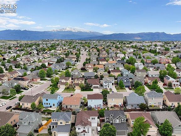 Great curb appeal w/this 5BR, 4BA, 2-story home located in the popular community of Ridgeview at Stetson Hills in NE Col Spgs. Well manicured front yard w/extended driveway, covered entrance & storm door. Inside, you'll find beautiful wood laminate floors throughout the ML. Central air & heat for year-round comfort. Drapes, rods, & window blinds throughout. Remote controlled blinds on the stairs. There is a convenient Powder Bathroom off the Entry. The Entry leads into the Living Rm where you will find a lighted ceiling fan & wall of windows that flood the room w/natural light. On chilly nights you can cozy up to the gas-log FP w/tile surround. The Eat-In Kitchen features a pantry, planning desk, & white cabinets w/granite countertops. Appl incl a smooth top range oven, built-in microwave, dishwasher, & French door refrigerator. A slider takes you out to the backyard patio for outdoor dining & relaxation. Upstairs, the hallway provides a built-in bookcase. The Laundry closet incl upper cabinets. There are 4BRs w/neutral carpet & 2 Full Bathrooms. The Primary BR is a private retreat w/lighted ceiling fan, walk in closet, & adjoining Full Bathroom. The Primary Bathroom has a dual sink vanity, mirror, & deep soaking tub to help you relax after a long day's work. A huge 22x16 BR features 4 built-in bunk beds w/built-in undermount lights for each bed. Awesome for multiple children w/space for each child to have their privacy. This BR & 2 more share a Full Hall Bathroom. The Basement offers a versatile space currently used as a Family Rm & Gym Area. There is an addtl 5th BR & Full Bathroom, perfect for guests or teens. Oversized 2-car garage. The fenced backyard features a patio & lawn area w/playset that stays. Walking distance to schools & 3.5 acre Jared Jensen Park, where you can enjoy a skateboard area, inline skate court, basketball, picnic pavilion, playground, & .3 mi sidewalk loop. Easy commute to Powers Corridor for shopping & restaurants, & all military bases.