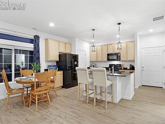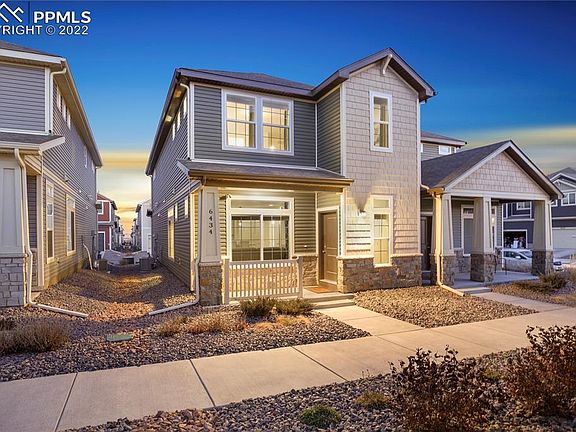 Stunning inside and out, this lovely 3 bed/3 bath/2 car garage home is spotless! Built in 2020, this home boasts lots of modern upgrades and amenities. Walk inside and be impressed by the luxury vinyl wood floors in the kitchen, and dining room. With an open-concept floor plan, entertaining in this space is effortless. In the kitchen, there is so much to love including rich dark granite countertops, matching appliances, tall cabinets, a deep stainless steel sink, lovely light fixtures, and a 2 seat island. Take note of the excellent use of space featuring a charming office nook under the stairs! Strategically designed, this home is fully xeriscaped and managed by the HOA allowing you to skip the mowing and spend more time with the ones you love. Upstairs discover 2 bedrooms, a full bath, a laundry room, and the master suite with an en-suite bathroom. Find your sanctuary in the spacious master bedroom with space for a cozy reading corner, or additional home office nook. The en-suite master bathroom does not disappoint, with a jack-and-jill sink, water closet, and standing shower. This lovely home is topped off with a 2 car garage. Even more, the location is central and convenient, AND is a part of the coveted Banning Lewis Ranch community –amazing schools, access to the clubhouse, fitness center, a community pool, and a playground make this home shine! Only minutes to Powers Blvd, Highway 24, shopping, grocery, dining, and activities. This home is also close to military bases. Book a showing today!