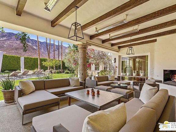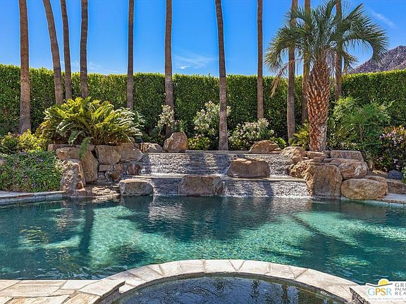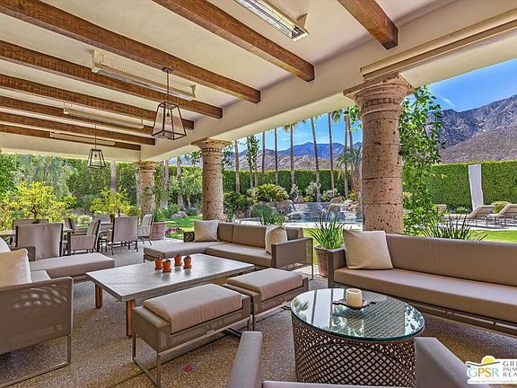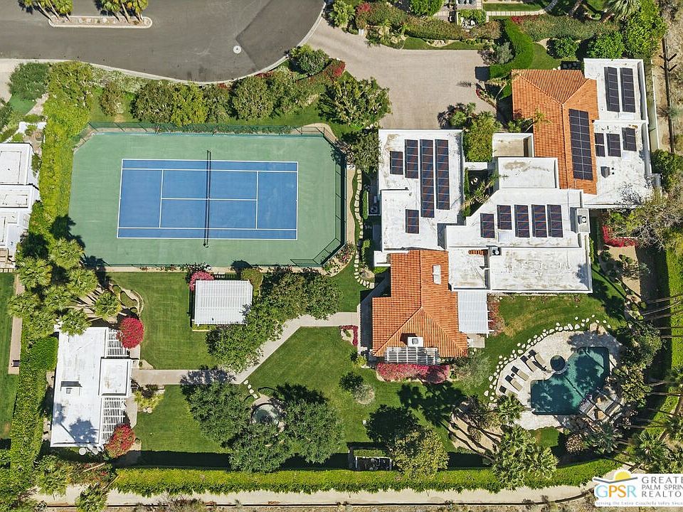Tucked within the exclusive gated community of Bella Monte in South Palm Springs, this extraordinary tennis estate spans 1.3 acres of lush, meticulously designed grounds, offering the pinnacle of luxury desert living. Reimagined by renowned designer Orlando Diaz-Azcuy, this estate blends timeless materials and modern elegance to create a one-of-a-kind sanctuary. Sophistication greets you at every turn from reclaimed wide plank walnut flooring and Cantera stone to antique lighting and hand-selected stone imported from a mosque in India. The result is a curated mix of textures and tones that elevate every living space. The formal living room, family room, and dining area flow seamlessly, anchored by a stunning wet bar with custom cabinetry perfect for entertaining in style. The chef's kitchen is both functional and beautiful, outfitted with handmade cabinetry, limestone slab countertops, and top-of-the-line appliances including Sub-Zero, Wolf, Miele, Viking, and Fisher & Paykel. It's a culinary haven and a natural gathering space for guests. The expansive primary suite is a true retreat, featuring a fireplace, tranquil views of the pool and gardens, a spa-inspired bathroom, and an oversized walk-in closet. A private office, den, and an additional powder room complete the primary suite. Two well-appointed en-suite guest rooms offer comfort and privacy, with one currently used as a gym. Outside, the grounds rival any luxury resort with towering palms, mature citrus trees, water features, and a spectacular custom pool and spa with a raised babbling brook waterfall. A spacious covered patio with heat lamps and a fireplace creates the perfect ambiance for al fresco dining or relaxed evenings under the stars. The one-bedroom guest house is equally impressive, offering its own living room, kitchen, and full bath ideal for visiting friends and family. At the heart of the estate lies the crown jewel: a private tennis court with a resurfaced US Open inspired color scheme (2022) and an adjacent tennis pavilion surrounded by manicured gardens making it an entertainer's dream. Additional highlights include a 3-car garage with paver motor court, owned solar with 86 panels, and 4 Tesla Powerwalls for sustainable, energy-efficient living. This estate is more than a homei t's a rare and refined lifestyle experience, offering privacy, grandeur, and exceptional amenities in one of Palm Springs' most coveted communities.