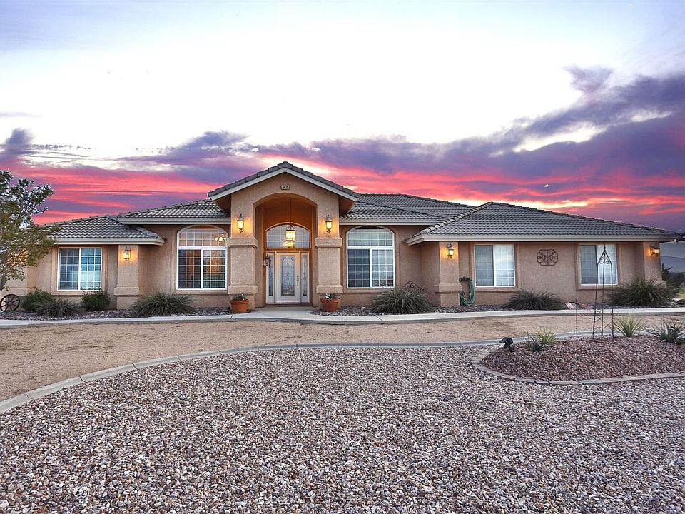 Welcome to your little piece of paradise tucked away in the heart of the high desert. This beautiful custom Deserada home features 2,738 sqft of living space on over 2.23 acres of fully fenced land! 4 bedroom, 3 bathrooms & a large BONUS ROOM that can be turned into a 5th bedroom or used as office space.3 car garage & RV carport that fits two RV's (24x30) & 50 amp RV power plug that's connected to the garage. This property has been well maintained & no details spared! The property has beautiful landscaping in both the back and front of the property which also includes automatic sprinklers and drip system to make sure all your plants get the water they need. As you walk the property you'll also notice the custom built green house and lush fruit trees! Make your way to the backyard and enjoy the beautiful view of the mountains as you relax in your salt water pool/spa and take in the desert sunsets.The pool has a solar heating system to keep the water warm & has a remote control system to manage lights and spa without leaving the water! You also have a nice backyard island with built in BBQ & mini fridge! Perfect backyard for entertaining and enjoying those nice summer days outdoors! As we make our way back into the house, you'll notice the nice open layout of the kitchen and front room! Great size bedrooms & large master with its own glass slider out the backyard! Truly a must see property! Snowline school district & commuter friendly!