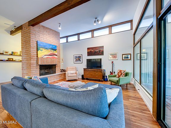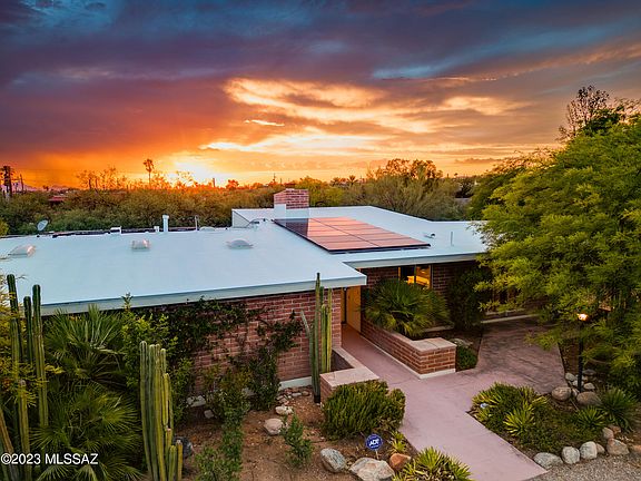 Stunning Territorial Meets Mid-Century Modern. Located on a beautiful 1+ acre lot with breathtaking mountain views, this striking burnt adobe Foothills District 16 home features 4 bedrooms, 2 bathrooms, an office, and a large family/game room. Open and bright updated kitchen with breakfast bar, stainless steel appliances, opens to the dining area with built-in buffet cabinet. Adjacent Butlers' Pantry and laundry room provide generous additional storage. Engineered hardwood floors were installed in all bedrooms, living room, and family room 5 years ago. Gorgeous living area with beamed ceilings, clerestory windows, floor to ceiling brick fireplace, modern and with Catalina Mountain views for days. This custom adobe home has great architecture-inside & out and was once featured in Tucson LifeStyle!