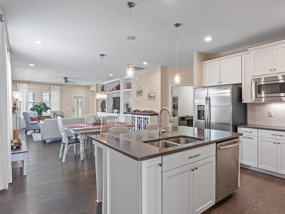 - Bathtub/Shower Combination, Bookcases, Ceiling Fan(s), Double Vanity, Eat-in Kitchen, Entrance Foyer, High Ceilings, Living/Dining Room Combination, Pantry, Master Downstairs, Quartz Counters, Separate Shower, Smooth Ceilings, Tray Ceiling(s), Walk-In Closet(s), Walk-In Shower