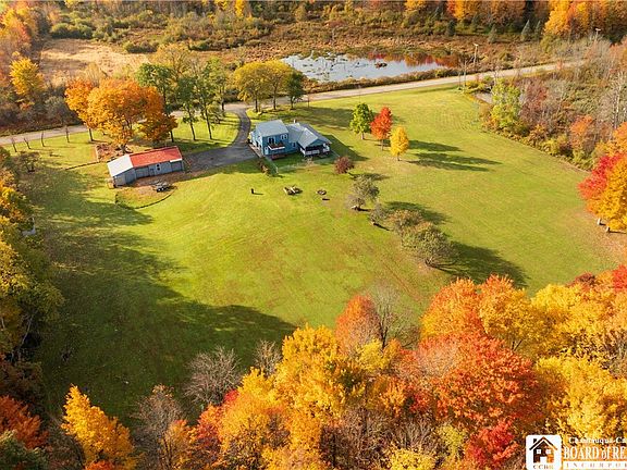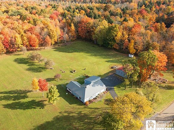 What an amazing make over on this country home on 41.5 acres! This 3 bedroom, 2 bath home features new roof, gutters, siding, windows, doors, driveway, flooring, lighting, decking, sliders, kitchen, baths and more! Main floor...living room with wood stove, wall of built-ins & sliders to the side yard, updated kitchen w/ quartz counter tops & new appliances, dining room with vaulted ceiling, two bedrooms, full updated bath/laundry room plus mud room off the 2+ car attached garage. Upstairs...Completely remodeled master bedroom suite...loft, walk-in closet, loft area, balcony over looking the property and master bath with tiled shower & separate soaking tub. Detached garage/shop (30x40) has electric, water & space heater in the office area, two garage doors, plus a enclosed lean-to(16x20). Enjoy the lovely private surrounding from the spacious covered composite deck...fenced area, too! Beautiful 41.5 acres in the Chautauqua Lake School district with pond, large open area and plenty of wooded acres....apple & plum trees, grapes, too! Lovely country elegance!!