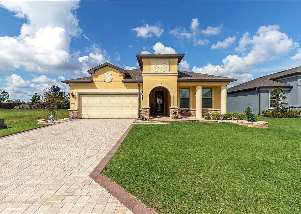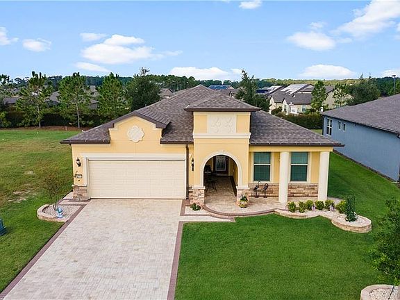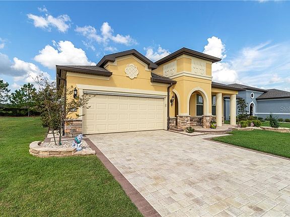 Beautifully customized and extended Abbyville Pool Home, 2/2/2 w/flex room, extended garage and extended lanai offers the very finest options available at Stone Creek! With a paver drive, walkway and an extended, raised and curved front porch (complete with stacked stone exterior 5), matching stone landscape surrounds, french drains, finished with river rock and composite ground-scape around the entire home, the exterior offers curb appeal galore. Step through the custom stained-glass entry to an expansive open concept floor plan with 2nd bedroom on right, finished with solid oak flooring, custom blinds, fan and lighting. The adjacent bathroom offers a walk-in shower comfort level cabinetry and fixtures. The airy, well-lit flex room lies between the guest wing and the Gourmet Kitchen which is finished in Granite with a large single sink and window, designer cabinetry, custom hardware, gourmet Stainless Steel appliance package with in wall convection oven and microwave, stained-glass pantry door and designer lighting. The kitchen opens to a spacious Great Room and Dining area all with custom fan and lighting as well as great views of the pool, lanai and backyard. The Master Bedroom and walk in closet, (w/built-ins), have been finished with oak flooring. The master bath offers a walk-in shower, granite counter, designer cabinetry and custom hardware. The indoor laundry is huge and has a lg multipurpose storage room. The 25 by 12ft lanai is totally screened and roofed with added electrical outlets. To the left of the lanai is a beautiful 25 by 28ft screened concrete patio with a 12 by 18ft salt water pool complete with robotic cleaner! The owner's entry connects to the garage which is equipped with built in cabinetry, shelving, finished floor, remote control roll up garage screen, high efficiency h/w heater, sprinkler control and a Kinetico whole house water treatment/carbon filtration system. Completing this wonderful package is a Taexx integrated pest control system for carefree insect control. Don't miss this Fairfield beauty!