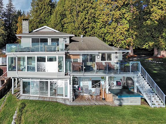Discover jaw-dropping vistas and panoramic 180-degree ocean views facing directly toward the splendid Trail Islands; this property presents the most magnificent sunsets! A short & gentle path to the ocean leads to a wonderful space for entertaining on the beach. The 5 bedroom, 4 bath home complete with an in-law suite is great for large families, caretaker, and entertainers! Featuring two kitchens, ample living space, floor to ceiling windows, 2 primary bedrooms (both with ensuites), and three guest rooms. The home boasts 2 fireplaces, a great floorplan with several decks and patio spaces. The main floor kitchen features an oversized island great for entertaining. Foreign buyers welcome.
