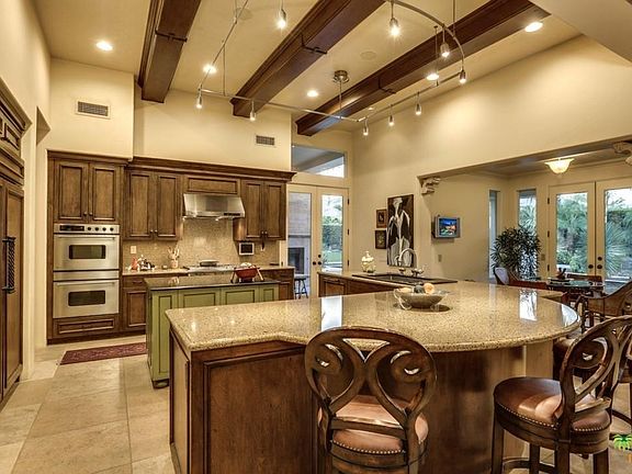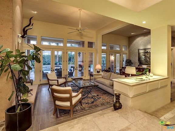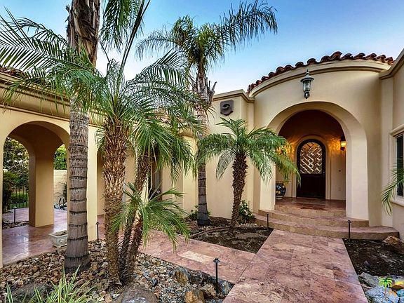 One of the most beautiful homes in Palm Springs! In guard-gated Bella Monte. This private home offers magical mountain views & is wonderfully appointed. A formal entry opens to soaring ceilings throughout, clerestory windows and walls of glass. Formal living w/ fireplace & open dining. The chef's kitchen includes a breakfast nook & opens to family room w/ bar and FP & Butler's Pantry. 3 En-Suites in main house includes the opulent master w/ sitting room & FP. Full library & separate detached casita. The highest of craftsmanship shows through the fine wood built-ins, Travertine floors, kitchen w/distressed cabinetry, center island, high-end appliances, spa quality master bathroom, wood paneled library & more. The S & W facing yard backs to "nothing" & offers a lovely pool, spa, fountains, BBQ area, lush gardens & the mesmerizing covered patio with another fireplace. Dramatic archway too and two garages. Comfortable & yet so sophisticated.