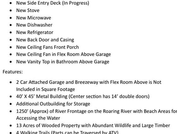 Beautiful German Chink sided cabin situated on approx. 12.98 wooded acres. LA quarter of an acre of the property runs along the banks of the river offering approx. 1,250 ft of river frontage. Home is perched above the rushing waters of the Roaring River. Sit on the front porch, watch the water and listen to the soothing sounds it creates. Home offers an open concept with vaulted ceilings, primary suite on main level, additional bedroom upstairs and flex/bonus room over 2 car attached garage. 2 full baths and 2 half baths, sunroom and separate dining room. Additional outbuilding and large 40x45 metal building with 14 ft doors on middle section. Great for RV/Camper storage as well ATV’s or a boat. Walking/ATV trails through the property as well as a serene creek with year round water flow. New paved driveway, new deck, new appliances and updated primary bath. Call us to schedule your showing and soak in all that nature has to offer. Welcome home to your very own riverside oasis!