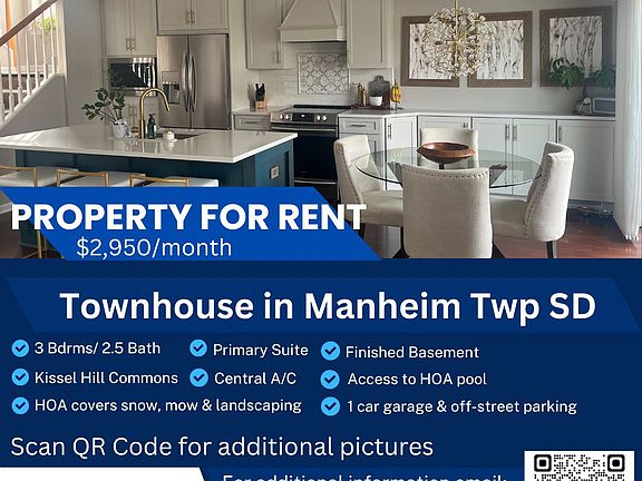 Located between historic Lititz and vibrant Lancaster this meticulously maintained & beautifully updated end-unit townhome in Kissel Hill Commons is in the highly desirable Manheim Township School District. Home features a one car garage, three bedrooms, 2.5 baths, custom designer kitchen (with new appliances), fully finished basement, first floor laundry & new composite deck off dining room. Primary bedroom includes a large walk-in closet plus an incredibly spacious en suite bathroom with double vanity & linen closet; separate toilet & shower. Across the hall from the primary are the second and third bedrooms- both adequately sized with large closets and a shared full bathroom. Community includes plenty of green common areas & walking paths (perfect for dogs), a community pool [available with annual membership] and a pizza shop within walking distance. HOA [paid by owner] includes snow, mow & landscaping- which means no yard work! Conveniently located with easy access to routes 222, 30 & 283 plus only a 10 minute drive to Lititz and/or Lancaster City. UPMC Lititz & LGH locations within minutes. This townhome has plenty of space in all the right places & is move-in ready on 6/1. Owner pays for water, sewer and HOA. Renter responsible for all other utilities