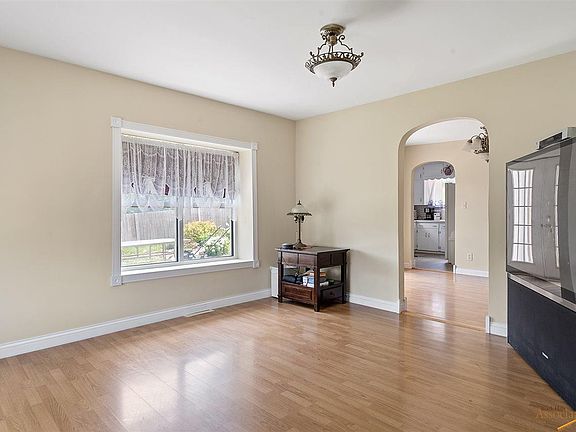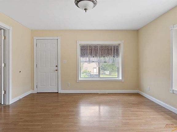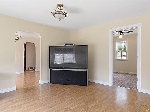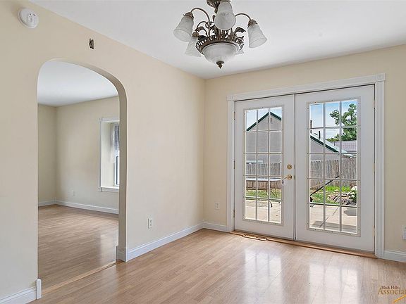 Charming one level living in this updated 1904 ranch home! Great location near downtown Sturgis and Ft. Meade. 2 bedrooms (one very large) and 1 bathroom (with claw foot tub/shower), formal dining room with french doors and arched doorways, sunny living room with deep window sills. All kitchen appliances plus stacking washer/dryer stay. Central air conditioning. Cute kitchen just off hall there are steps to a clean, dry basement for the furnace, water heater, deep freeze and extra storage. Long 60' driveways with detached garage. Completely fenced yard that sits above sidewalk with flower gardens and more beds for flower or vegetables. Incredibly well-maintained and updated home!