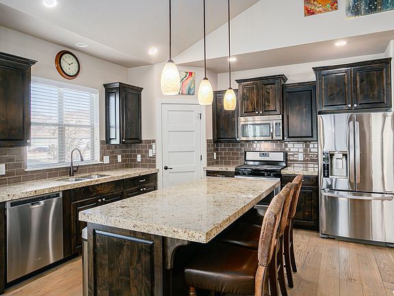 Stunning house that is ready for you to call home! Walking through the foyer welcomes you into the warm inviting living room with fireplace and open concept kitchen with dining room. Vaulted ceilings add to the openness and natural light. The main floor master suite includes a deluxe master bathroom, luxurious bath tub, separate shower and a walk in closet. Upstairs includes two spacious bedrooms with a full bath. A separate laundry room and guest half bath is also located on the main floor. No details spared in upgrades from granite countertops, cabinetry, wood floors, custom closets and beautiful tilework. The fully finished basement includes a master suite, an additional full bath with jetted tub, an upgraded deluxe kitchen, along with a great room with a magnificent fireplace and an additional bedroom. A cold storage room is also located in the basement and there are hook ups for an additional washer and dryer. Located in desirable Mapleton, Harvest Park, the grounds are impeccably landscaped and maintained with a community park. Conveniently located within walking distance to Maple Ridge Elementary and the new Jr. High school opening in 2021. Sq. ft. figures provided as a courtesy estimate only and were obtained from county records. Buyer is advised to obtain an independent measurement.