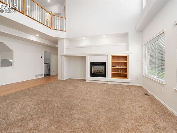 Located in the heart of Jackson Creek, this 2 story with mountain views, is located within walking distance of Bear Creek Elementary and is minutes from shopping and access to 25 .The layout can be used as either a 6 bedroom + an office or a 5 bedroom + 2 offices due to built-ins. Formal living and dining areas as well as a great room with an 18+ foot ceilings add to flexibility for any lifestyle. The kitchen opens directly into the family room which makes this a great entertaining space. Kitchen features include a large island, stainless steel appliances, tile countertops and a pantry. A gas fireplace is shared between the great room and the office. The west side wall of windows takes in the views of the front range. The washer and dryer are included with this main level laundry and has additional storage space as well as a sink. There are 4 bedrooms upstairs of which one has built-ins for an office. The primary bedroom has an amazing view of the mountains and Pikes Peak, a 5 piece bath with a fireplace and a large walk in closet. Two additional bedrooms and bath are located in the basement with a secondary family room, a 3rd fireplace, a sitting area and a wet bar.Additional features include a 3 car garage, newer furnace and AC, LVP upstairs and in the main level office.
