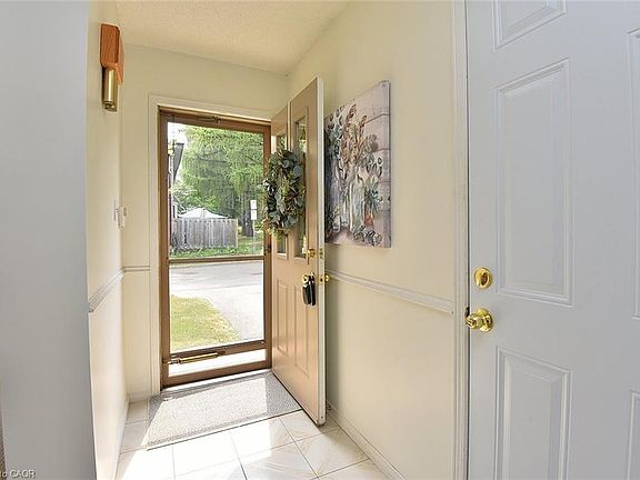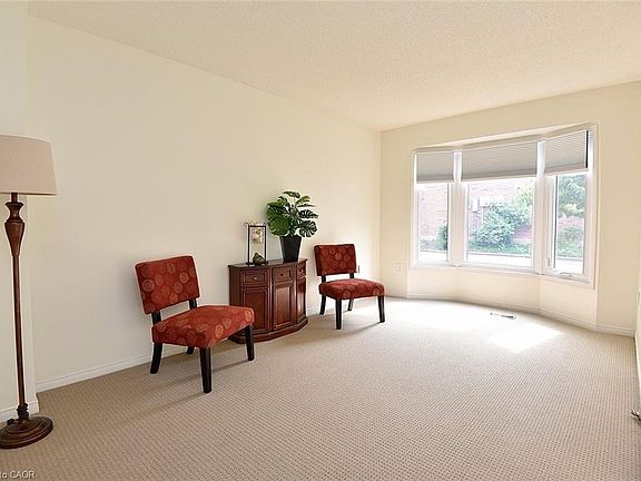 Discover exceptional living in this meticulously maintained 3-bedroom, 3.5-bath end-unit townhome in a tranquil complex of just 20 units. Ideally situated near shopping, restaurants, parks, schools, recreation centers, and major highways (Linc and 403/QEW), this home combines prime location with refined comfort. The bright main floor showcases a welcoming living room with a bay window, brand new carpet, a conveniently placed powder room, elegant family room with hardwood floors, gas fireplace and California shutters situated beside a sophisticated open-concept dining area. The renovated kitchen dazzles with neutral ceramic flooring, quartz countertops, stone backsplash, SS appliances, and a distinctive coffee bar featuring raised counter and shelving. Upstairs, the primary bedroom retreat offers serene space with dual windows and California shutters, complemented by a spa-like ensuite with grey stone countertop, undermount sink, deep tub and stand-alone shower. Two additional well-appointed bedrooms with California shutters and generous closet space and a second 4-pc bath complete this level. The finished basement extends your living space with a recreation room featuring a custom built-in bar with sink and mini-fridge, built-in shelving with desk area ideal for a home office, practical laundry room, and 3-pc bath with stand-up shower. Additional features include a single attached garage with inside entry and a brand new interior door, central vacuum system, new light fixtures on every level, gorgeous perennial gardens and convenient visitor parking beside the unit and just steps away. The hallways, primary bedroom and living room have all been freshly painted. Move-in ready with tasteful, neutral décor throughout, this exceptional townhome offers the perfect blend of privacy, style, and convenience in a friendly, close-knit neighborhood. What an ideal setting for both comfortable everyday living and elegant entertaining in the home and outdoors on the private deck.
