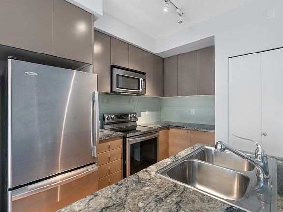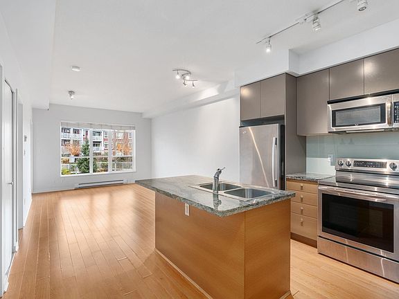 BRIGHT 1 BED + DEN | QUIET FOURTH FLOOR LIVING at Waterstone. This beautifully updated home features fresh paint, new blinds, and peaceful north-facing views overlooking the inner courtyard—zero traffic noise. The open layout offers a spacious den for work or nursery, and a rare opportunity to choose your own flooring color upon purchase. Enjoy 9’ ceilings, oversized windows, and access to Waterstone’s famous 15,000+ sq ft of resort-style amenities: indoor pool, hot tub, full gym, theatre, fireside lounge & more. Close to shops, dining, and future SkyTrain. A standout home for first-time buyers or investors.