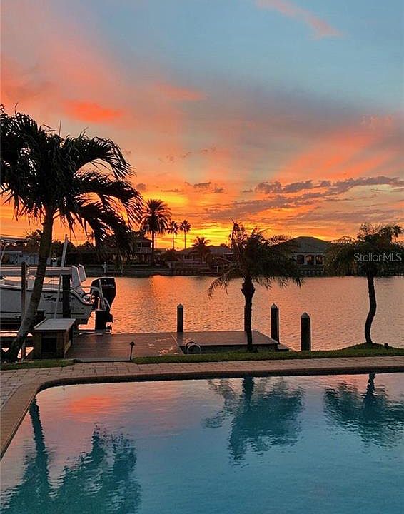 One or more photo(s) has been virtually staged. This is a well maintained, quality waterfront home with awe-inspiring water and sunset views of Boca Ciega Bay in one of the gulf beaches most desirable neighborhoods. You are greeted with a circular driveway and covered porch with a cheerful front door leading into the formal family room with plantation shutters, vaulted ceiling and exposed beams. Glass french doors lead into the kitchen, featuring granite countertops, custom all wood cabinets and a breakfast bar. Chefs will appreciate the Viking Professional Series appliances, dry bar and wine refrigerator. Lots of space to spread out (or come together) with an open concept layout. The living room has a real wood-burning fireplace flanked on either side by built-in bookcases. Split plan dual master bedrooms with en-suite bathrooms and an additional powder room off the living room. Whole house water softener, propane Tankless hot water heater (2020), concrete tile roof, hurricane windows (windows installed in 2015), and HVAC in 2017. Superb outdoor space...an expansive waterfront covered patio with matching pavers and open deck that's perfect for entertaining...salt water heated pool (solar cover & newer pool pump) and propane-heated spa, trex dock with 10k lift...with endless sunset views! The home is on a cul de sac in a quiet neighborhood with underground utilities. This is a meticulously maintained and cared for home. A short drive to Tampa International Airport and a quick walk to the sugar sand beach, shopping and restaurants in St. Pete Beach.