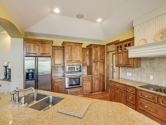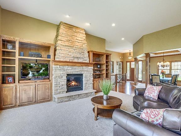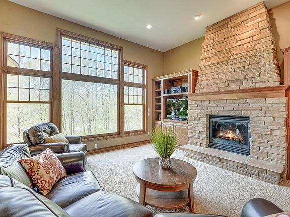 Beautiful one level, 3BR, 3BA home with unique architectural detail on 200' of south facing lakeshore on Sunders Lake! This almost 3/4 acres wooded lot provides gorgeous views from nearly every room. This home has soaring ceilings and picturesque windows that bring in the natural light and views. Three fireplaces, built-in cabinets, gourmet kitchen, hearth room, cherry woodwork throughout make this an executive style home. Walkout lower level features large custom bar, sauna & 3rd fireplace