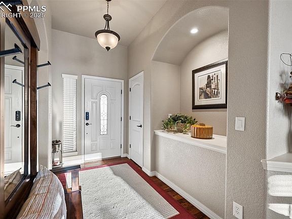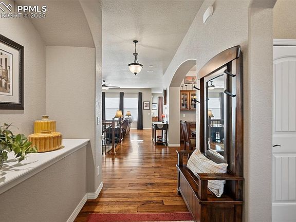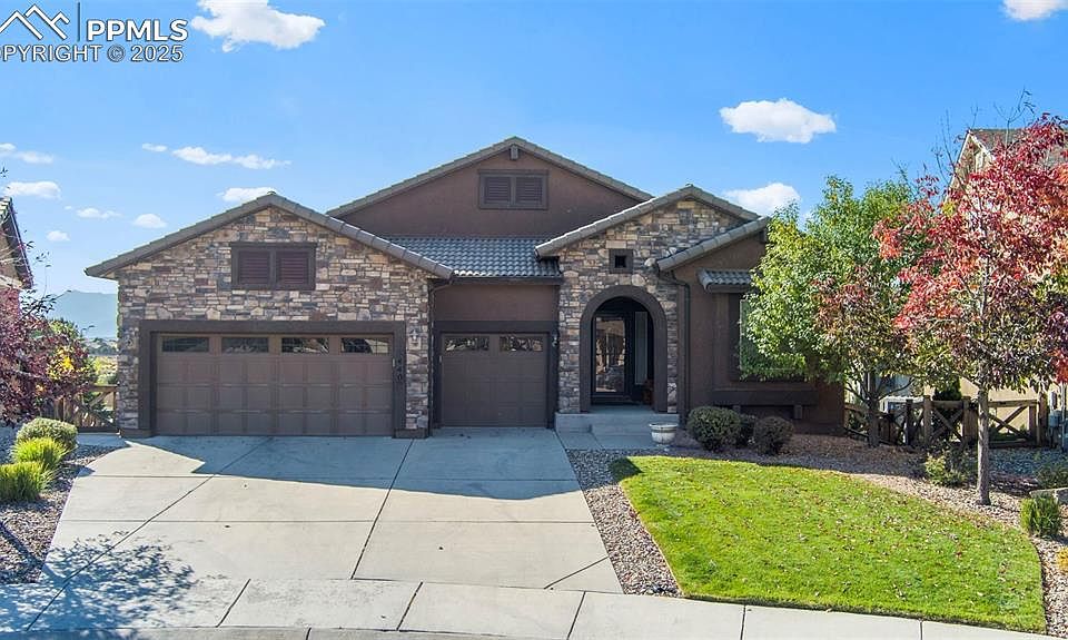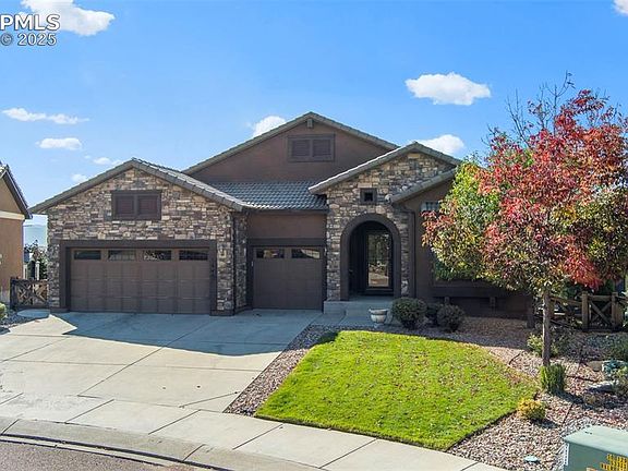 Welcome home to this stunning, meticulously maintained ranch home in award-winning Banning Lewis Ranch. Luxury defined, the main level features an open and flowing floor plan bathed in natural light. Cook like a pro chef in the spacious kitchen with granite countertops, extended island, counter space, and cabinetry, gas 5 burner cook top, oven with Advantium 5 in 1, soft close drawers, built in spice drawer, pantry and dining area. Formal dining room includes built in shelves and a butlers pantry. The luxurious main level primary bedroom with a walk out to the upper patio includes dual vanities, spacious walk-in closet, oversized tub and stand alone shower. The second main level bedroom is ready to be turned into your home office or nursery. The basement level includes the home theatre and wet bar areas, a junior primary suite and 2 other bedrooms, plenty of storage area as well as a walk-out to the lower patio. Say goodbye to electric bills with the included 9 Kw DC/6.7 Kw AC power photovoltaic (solar) system. Perfectly upgraded throughout from the gorgeous hickory floors to the 11' main level ceilings, 9' basement ceilings, gas fireplace, whole home vacuum, mud sink, wet bar, home theatre with 110' HD projector wired for 7:2 surround sound, walk out basement, dual patios, 3 car garage, and wired internet in all rooms. All of this is topped off with amazing mountain and Pikes Peak views!! Banning Lewis Ranch is an award-winning community with unrivaled amenities including: club house with 24-hour fitness center, YMCA guided exercise classes, junior Olympic-Size pool, kids splash park, pickelball courts, basketball courts, tennis courts, dog parks, numerous playgrounds, over 65-acres of parks, trails and recreational areas. Don't forget to attend the summer concerts in the park, outdoor markets, and holiday fireworks displays. Conveniently located close to shopping, dining, entertainment, and easy access to military bases. Schedule your private showing today!!