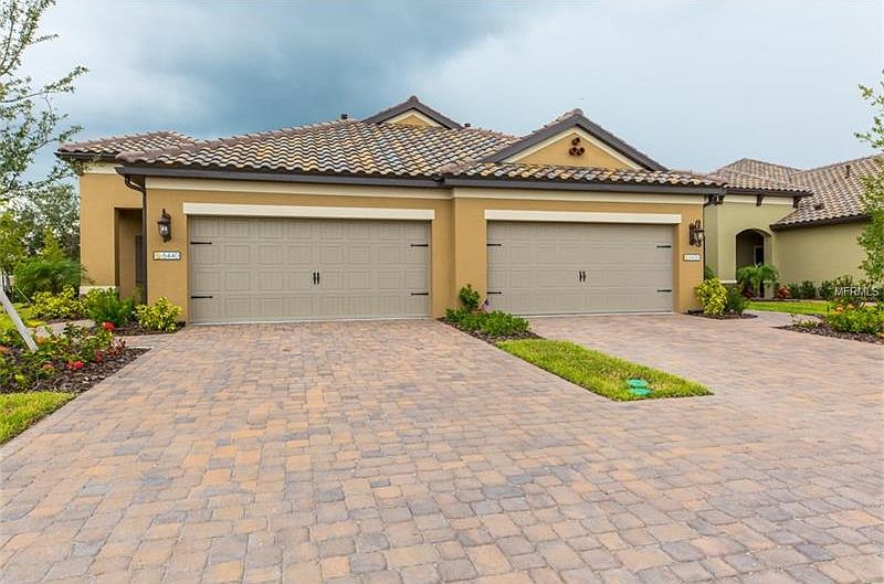 Truly move-in ready. Owners have occupied this Villa for less than six weeks. Nestled in the back left of the development, on pie-shaped lot which allows for additional privacy in the extended lanai, which has pocket sliding doors and backs up to a quiet restful surrounding. Make this your dream of a lifetime. Discover the refreshing individuality of Villa Amalfi. Located for easy commute to downtown Sarasota or Bradenton. Two Bedroom two bath and den, this has an open floor plan with the dining area cozy for family and big enough for company. Hurricane shutters give you a peaceful feeling during this hurricane season. Master bath has dual sinks, roman shower and well selected fixtures which brings lifetime beauty to your bathroom. Look forward to your quiet hours in the Den perfect for relaxation or work. Handsome tile flooring in main areas, solid surface quartz countertops, stainless steel appliances and under counter lighting. This villa has thoughtfully planted and planned outside landscaping. Low Hoa and no CDD on this one. Community pool is right down the street. Furniture may be purchased on separate contract .
