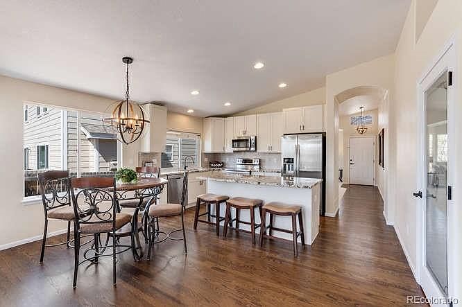 PROPERTY IS VACANT. SUCH A GORGEOUS HOME. TOTAL OPEN CONCEPT KITCHEN/FAMILY ROOM. FEELS HUGE!!! GORGEOUS BACK YARD WITH LARGE PATIO & BACKS TO WALKING TRAIL!!! REMODELED W/BRAND NEW CREAM SHAKER KITCHEN AND BATH CABINETRY (SOFT CLOSE), BRONZE FIXTURES, ELEGANT BACKSPLASH, BEAUTIFUL GRANITE COUNTERTOPS. STAINLESS APPLIANCES, NEW PAINT (INSIDE), CARPET, MODERN RAILING, FABULOUS REFINISHED HARDWOOD FLOORS ON ENTIRE MAIN LEVEL EXCEPT LAUNDRY AND BATHS. COMPLETELY REMODELED BATHS TO INCLUDE BRONZE SHOWER ENCLOSURE IN MASTER BATH AND BASEMENT BATH. THE ENTIRE BASEMENT WAS JUST FINISHED. (ALL PERMITTED). ALL NEW BRONZE HINGES AND DOOR KNOBS. SIX PANEL DOORS THROUGHOUT. BRAND NEW DRIVEWAY, FRONT SIDE WALK INTO HOUSE, STOOP AND LEFT SIDEWALK TO BACK YARD. PRICE PER SQ FT VERY LOW COMPARED TO OTHERS SOLD IN THE SAME SUBDIVISION.