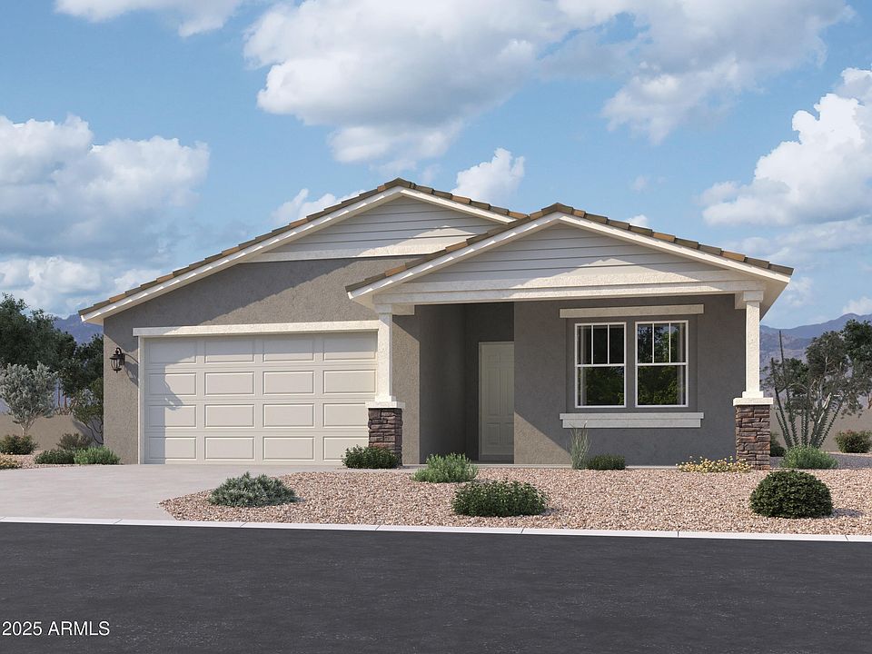 Discover Skyline, San Tan Valley's newest community! This single-story Lavender floorplan offers 4 bedrooms, 3 baths, a guest retreat, and a 2.5-car garage with Craftsman-style charm. Enjoy designer-selected finishes from the Harmony Collection, including 42'' white cabinets, quartz countertops, a tile backsplash, gunmetal hardware, matte black fixtures, and wood-look tile throughout main areas. A 12' sliding glass door connects the great room to the backyard, perfect for indoor-outdoor living. Move-in ready with blinds, fridge, washer, dryer, and soft water loop. Community amenities include a pool, splash pad, basketball, volleyball, pickleball, tot lots, walking paths, fitness center, and a community kitchen. Don't miss this opportunity!
