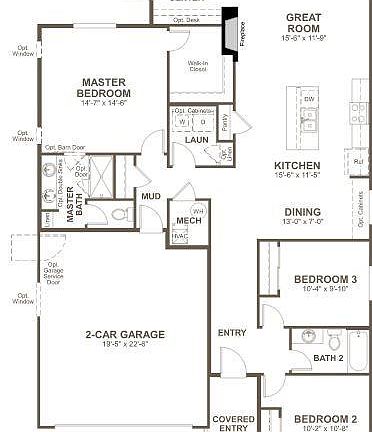 Enjoy single-floor living in this inspired Onyx ranch floor plan! At the front of the home, you’ll find two bedrooms flanking a full bath. Toward the back, there’s a well-appointed kitchen nestled between an elegant dining room and generous great room that welcomes you with views of the covered patio. A tech center provides added convenience! The laundry is located near the primary bedroom, which has a large walk-in closet and a private bath.