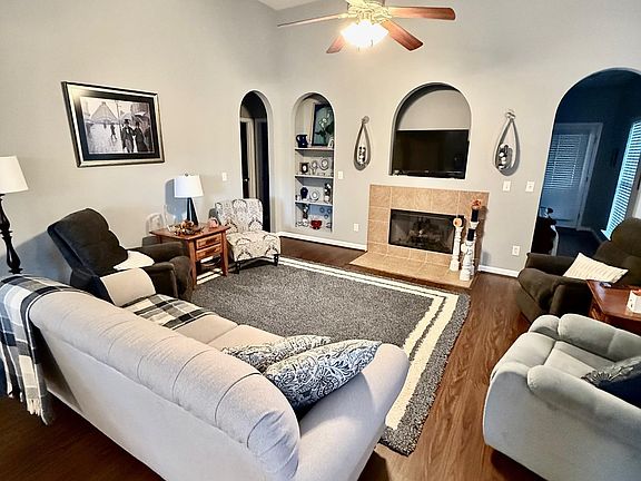 Spotless!!! Move In Ready ~ Open Floor Plan ~ High Ceilings ~ Wood Flooring ~ Nice Gas Log Fireplace with Built In Bookcase ~ Split Bedroom Design ~ Large Kitchen with an Abundance of Cabinets ~ Dining Area open to Kitchen & Great Room ~ Master Suite features Nice Trey Ceiling and Master Bath with Double Vanity/Separate Shower & Tub/Private Toilet Area ~ PRIVATE Rear Yard with Covered Porch and Patio ~ Privacy Fencing! Nice Area to watch the leaves this time of the year! Roof approx. 2 Years ~ Hot Water Heater installed in 2024 ~ HVAC recently serviced.