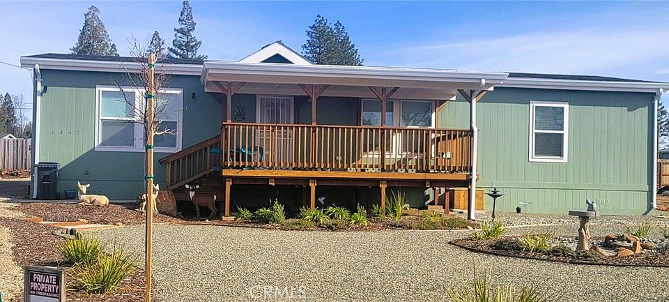 This 3bd 2ba home spans 1493 sqft on a .24-acre lot. As you enter, you will find the well designed living room with natural lighting, ceiling fan and laminate floors. Just ahead, the kitchen welcomes you with lowered, stone look laminate counters, making it effortlessly accessible. It also boasts a built-in counter-height microwave, a propane range, and a convenient walk-in pantry. A kitchen island with breakfast bar overlooks the dining nook, and living room creating a seamless flow for both casual meals and entertaining. The master bedroom features large windows that frame views of the beautifully landscaped front yard. A walk-in closet for ample storage, and the master bathroom is designed for accessibility, featuring a step-in shower with grab bars and timeless brushed nickel finishes. A unique pass-through door connects the master bathroom to the laundry room, enhancing functionality. The laundry room, which also has a doorway into the dining nook, is complete with storage, utility sink, and built-in shelves. The guest bathroom is equally well-appointed, offering a shower over tub with glass doors and built-in linen storage. The guest bedrooms feature large windows, ceiling fans, and newer carpeting, creating inviting spaces. Each secondary bedroom also includes a walk-in closet, providing ample storage options. For added convenience, there are no steps from the detached 2-car garage into the home, making it ideal for those with mobility challenges. The rear wooden deck invites you to relax and entertain, while the large covered front porch adds to the home's curb appeal. The fully landscaped yard showcases low-maintenance plants and decor, ensuring a visually appealing and easy-to-care-for outdoor space. The large lot provides space for outdoor activities and gardening and is located within walking distance to shopping and dining options and public transit. A quick drive down Skyway will lead you to Paradise and Chico for an easy commute as well as opening doors to a world of outdoor adventures, including fishing, water sports, and more. This property is just a short distance from Paradise Lake, DeSabla Lake, Lake Oroville Marina, and the Feather River. Also, as a member of the Paradise Pines POA, you'll have access to a clubhouse with meeting rooms and a library, as well as two event centers w/ full kitchens. Additional amenities include tennis courts, a bocce ball court, a children's playground, hiking trails, a swimming pool, a spa, and much more!