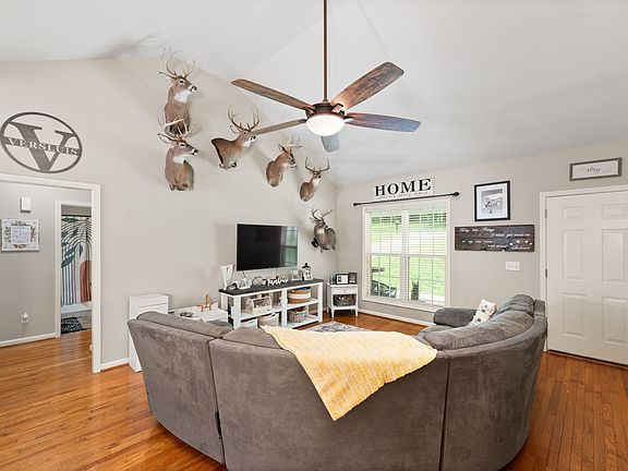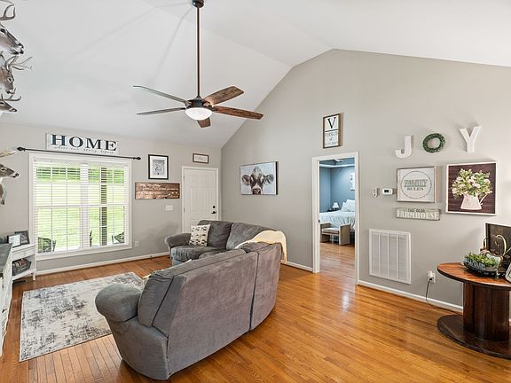 Welcome to a peaceful country home on a 2-acre lot, offering tranquility & convenience. This single-level gem features hardwoods & tile throughout, a spacious living room w/ 13' ceilings, & an inviting eat-in kitchen with SS appliances, a tiled backsplash, & a pantry. Primary bedroom offers a trey ceiling and ensuite bathroom. The secondary bedrooms are generously sized with ample closet space. Enjoy the serenity of the covered front porch, the of privacy of a 12x12 deck, the practicality of a 10x12 storage building, & the charm of a wooded back yard. The concrete drive & parking pad make for convenience & fun - bring your basketball goal or kids riding toys! Experience the best of both worlds - a quiet country location & easy access to all Springfield, White House & Cross Plains offers.