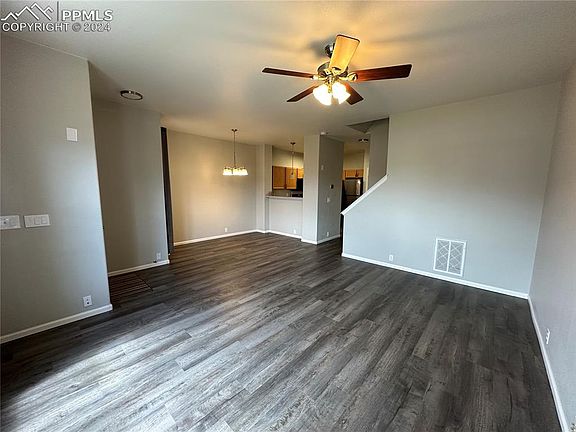 One of the Best views of Pikes Peak in the Entire Complex! You will find Fresh Paint and New Carpet in this wonderful 2-story townhome with attached two car garage. The main level features a spacious living room, dining space, kitchen, and 1/2 bath as well as access to your personal 2 car garage. Take the double landing staircase to the upper level where you will find the master suite that features incredible Pike's Peak views, a vaulted ceiling, full bath with dual vanity and a walk-in closet, two additional bedrooms, another full bath and laundry room. This home includes A/C with smart thermostat and smart lighting. Let the HOA take care of the outdoors for you, so you can enjoy the large park setting and pathways. This wonderful home is located near the Powers Corridor's new shopping and dining spots as well as near schools, fire station, and newer hospital. HOA Dues include: Insurance, Trash, Management, Common area landscaping, Water for the common area.