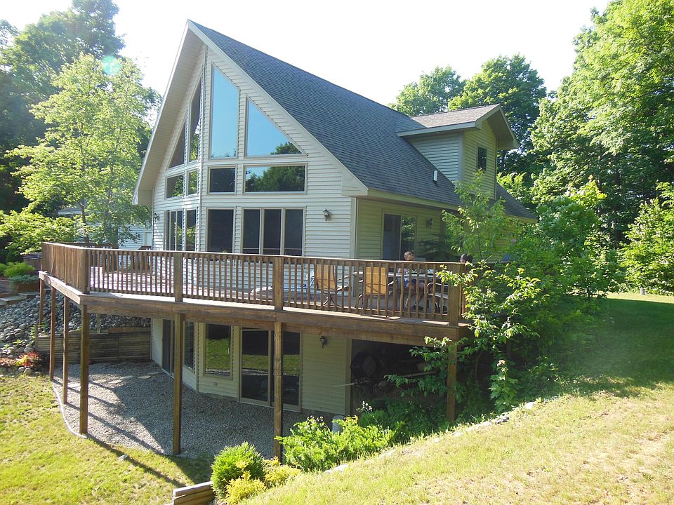 Picturesque & private! Prow-front chalet tucked in the woods offers vaulted tongue & groove ceilings, 4 bedrooms, 2 baths, full walkout lower level, & views in every direction. Well cared for with hardwood & tile floors, main level laundry, master loft with extra reading nook overlooking great room, fireplace, wrap-around decking & hot tub. 14-block lower level features high ceilings (needs finishing), double walkouts & plumbing for 3rd bath. Property offers easy care-but dramatic landscaping, blackberry patch & adjoining forest land with lots of trails to hunt or walk. Deeded access to West