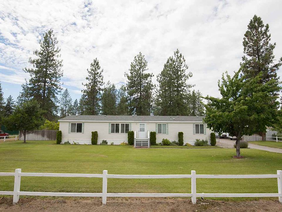 Peaceful 1.03 acre lot with spacious 3 bed, 2 bath mfg home in Nine Mile Falls. Just minutes to Long Lake, bring all hobbies and toys! Fully fenced back yard with custom wide gates to the 24x28 detached shop with opener and electric hoist. 12x24 storage shed with power, lights and workbench. Fire pit, swimming pool, horseshoe pits, back pasture for horses, riding atv's or fun! Newer roof, beautiful covered patio, elec. f/a heat, propane stove back-up, central a/c, fruit trees, great yard, all ready for you!