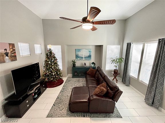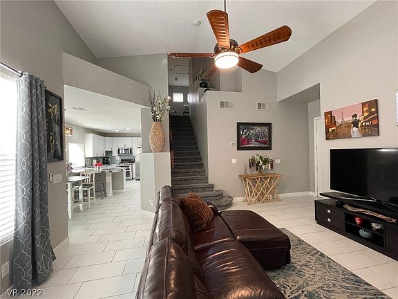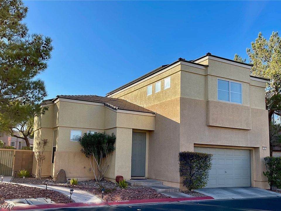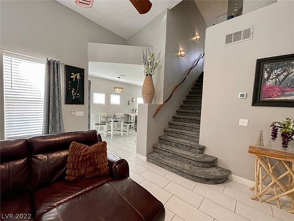 $40,000 PRICE REDUCTION Gorgeous 2 primary bedroom home in gated Desert Bloom, Summerlin. 5 minutes to Downtown Summerlin, Red Rock Casino and Pavilion Center. Solar panel paid off, winter electric bill of $25/mo to summer bill of $150/mo. Vaulted ceiling pot shelves, surrounded in natural light, extravagant ceiling fan when entering home. Completely remodeled; interior paint, 12"x24" tile, premium carpet & padding, gourmet kitchen stunning granite countertop, wine bar, huge island, sparkly backsplash, 42" custom cabinets, 2" blinds & beautiful curtains, 5" baseboards, ornate wine barrel stair rail. All stainless steel appliances, washer & dryer are 2 yr new. All bathrooms new vanities, curve showers, toilets, lighting & oil rubbed light fixtures throughout. Extended pavers, walking path from huge backyard to front. Tesla/EV 12V charger & custom garage cabinets. Water Smart front yard save $ water bill. Walking trail to Cottonwood Canyon Park to Tivoli. Community pool & spa.
